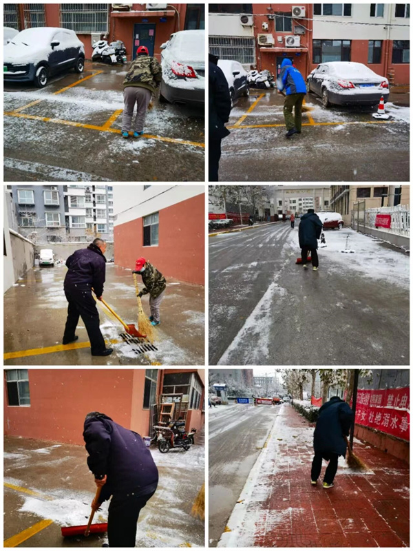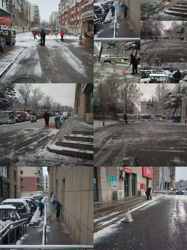 在各项目现场,物业工作人员分工明确,配合默契。有的用雪铲清理积雪,有的用扫帚清扫路面,有的在易滑路段铺设防滑垫、设置警示标志。尽管寒风凛冽,他们的额头却渗出了汗珠;尽管双手冻得通红,他们的脸上却洋溢着温暖的笑容。“看到物业人员这么早就起来扫雪,我们出门特别安心。”一位业主感动地说。